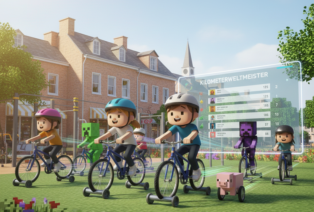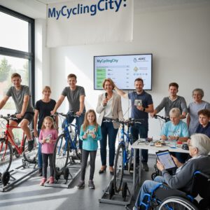 Ein Fahrrad wird in einen Rollentrainer eingespannt und los geht’s mit der Radtour. Ein kleines elektronisches Gerät erfasst die gestrampelten Kilometer und überträgt die Daten auf die Webseite https://mycyclingcity.de und die Spielplattform https://game.mycyclingcity.de. Hier gibt es verschiedenste Auswertungsmöglichkeiten für Wettbewerbe z.B. zwischen Teams, Klassen oder Einrichtungen. Die Erfassung erfolgt über anonyme ID-Tags, der Datenschutz ist in jedem Fall gewährleistet.
