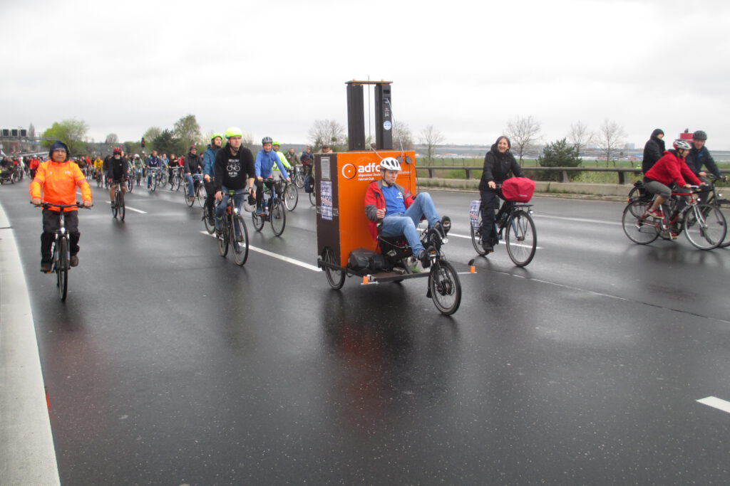 Nach unserem Finalen Start am Flughafen BER, jetzt schon auf der ersten Fahrraddemo „Schluss mit Autobahnbau, Lebenswertes Berlin für Alle“.