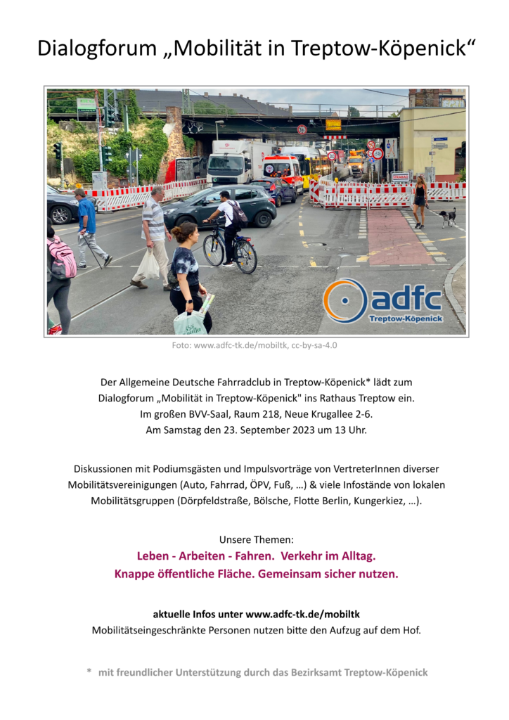 Wir freuen uns am 23. September 2023 13-19 Uhr alle Mobilitätsinteressierten ins Rathaus Treptow, Raum 218, Neue Krugallee 2-6 12435 Berlin einladen zu können. Mobilitätseingeschränkte Menschen können den Fahrstuhl auf dem Hof nutzen.