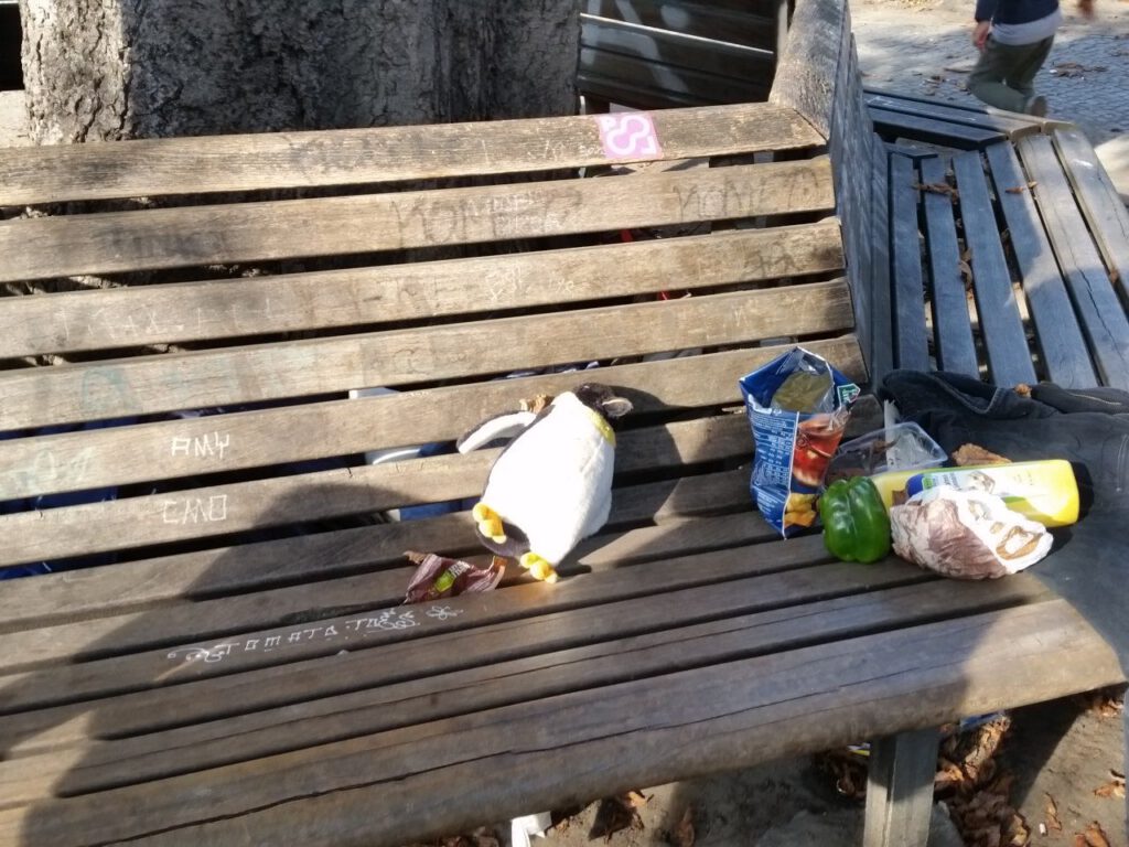 Aus der idyllischen Ruhe der Prinzessinengärten ging es durch den mehr als unangenehmen Berliner Verkehr zur Zwischenstation Reuterplatz, wo ein odachloser Pinguin für mich einmal mehr verdeutlichte, warum wir diese lange Tour zu einem besseren Wirtschaften und Leben überhaupt mitmachen.