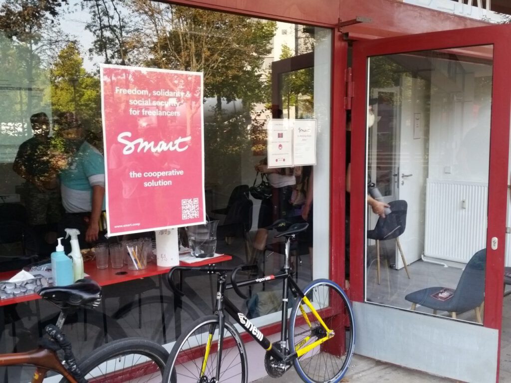 Unsere letzte Zwischenstation waren die Büros der Smart e.G. an der Mehringbrücke. Diese Genossenschaft bietet im Kern die sehr interessante Möglichkeit, das Einkommen aus einer Selbstständigkeit in ein Arbeitsverhältnis mit der eG umzuleiten und somit aus dem Selbstständigen einen ganz normalen Angestellten zu machen. Die Idee stammt aus Belgien, das Netzwerk an national eigenständigen Genossenschaften hat europaweit etwas 80.000 Mitglieder.